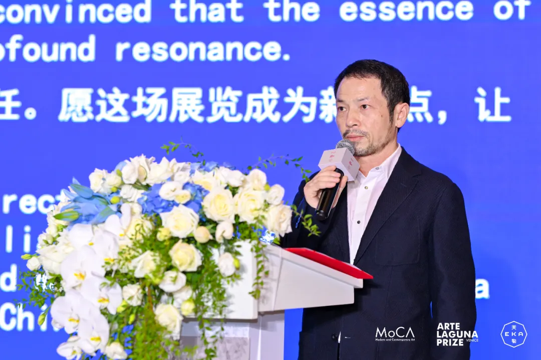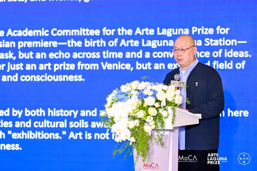 作为本次展览的总策展人,曾连续担任拉古纳国际艺术奖学术委员会委员的黄壹先生在开幕式上深入解读了展览的核心理念:上海作为亚洲通往世界的窗口,其兼容并蓄的气质让这里成为拉古纳艺术奖“对话的场域”,而非单纯展示空间,本次亚洲首展并非威尼斯及其他地区展览的简单延伸,而是以当代艺术语言为纽带,让不同地域创作相遇重组、形成跨边界文化共振的“新的文化生成”;为实现这一目标,策展团队以“工业美学”打造现实中的“网络世界”,2000余平方米展厅采用去中心化布展结构,不设主轴线与固定观看顺序,地面方盒子装置如“信息节点”嵌入数字影像增强沉浸感,还将展厅划分为四大板块引导观众层层递进体验“艺术故事”;同时团队尊重EKA·天物原始工业结构,仅将展墙处理为铁锈色呼应空间记忆,构建独特观看体验,策展人期待观众能留意方盒子间距“节奏”、地面反光与影像闪烁的呼应,感受铁锈墙、冷光与数字屏幕交织的“工业呼吸”,在不经意间被“引动”感知。