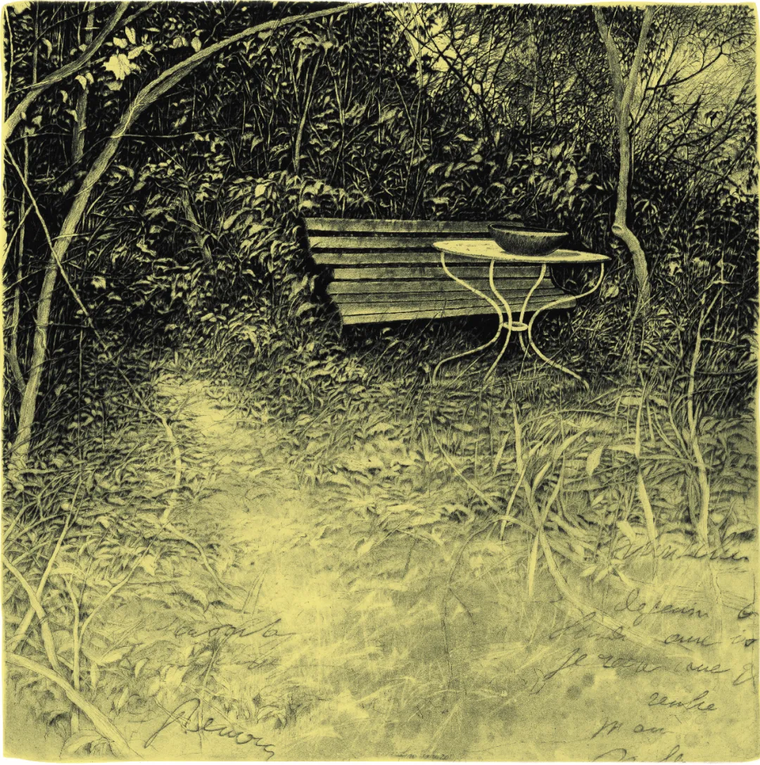 在他的版画和素描作品中,反复出现文字碎片,那些在笔触与明暗之间若隐若现的痕迹。这些片段并非单纯的图形标注,它们赋予作品一种引人入胜的意境,唤起一段或许遥远却依然鲜活的记忆。它们也揭示了艺术家与诗歌世界的深刻联系,这种联系如同内在的、微妙的、持续的韵律,贯穿于他的作品之中。