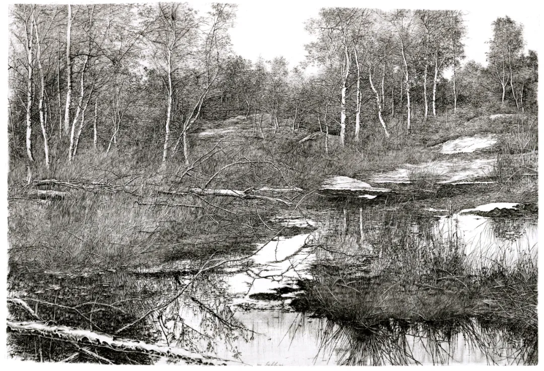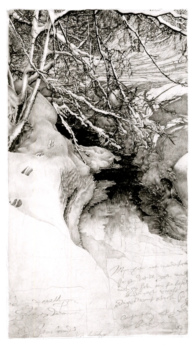 水传递出深度与无穷暗示:光与影的无尽织网,反射的纹理永不止息。它制造的镜像对我格外熟悉——那正是我在金属版上雕刻时所处的同一种状态:在那里,主体以相反、镜面的方式出现;直到印刷完成之前,我都无法验证其“真实”的视觉。我们的工作只能被“思考”:我们看不见它在生成之时的样子,一切都交付于手的经验与技艺的训练。