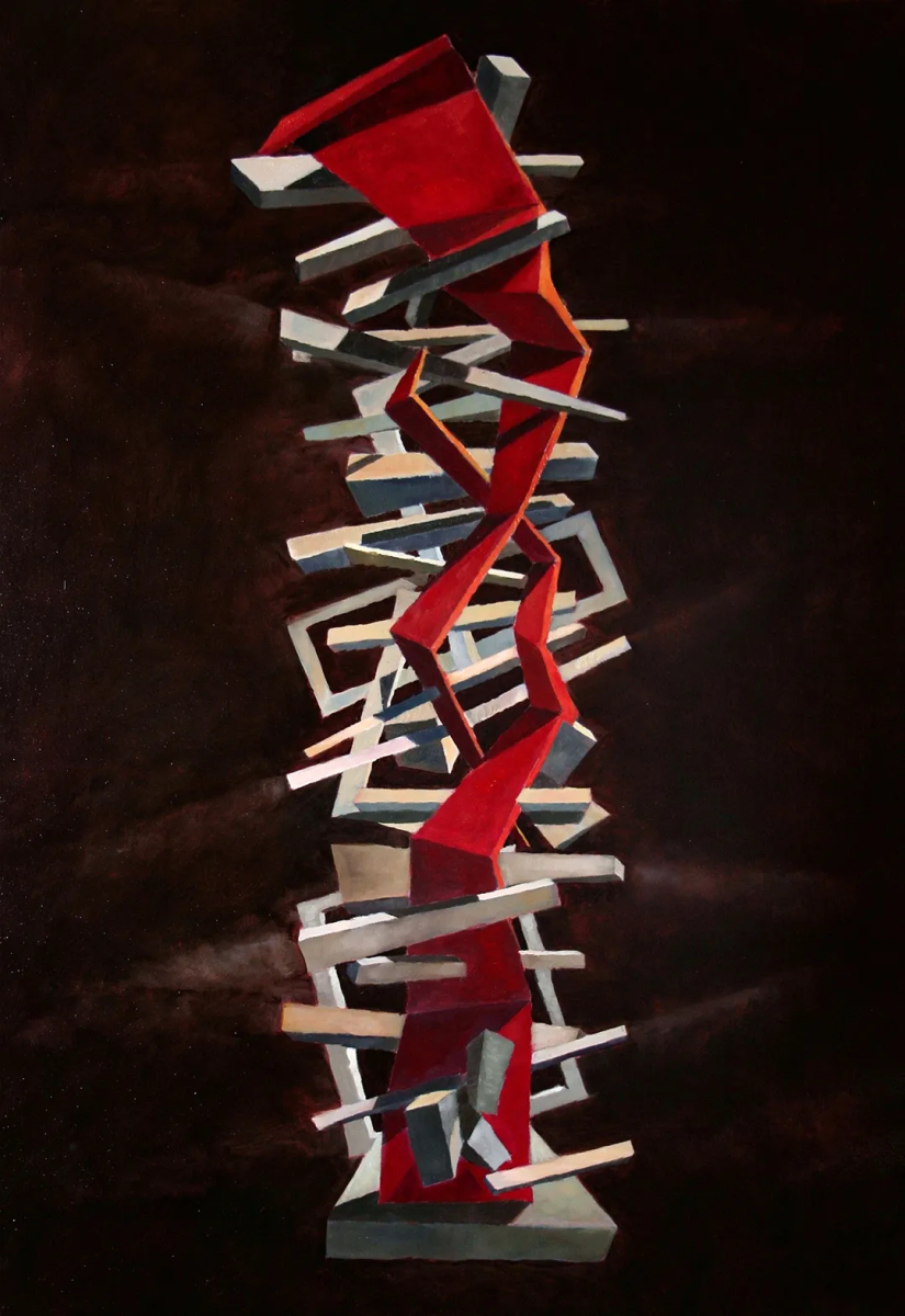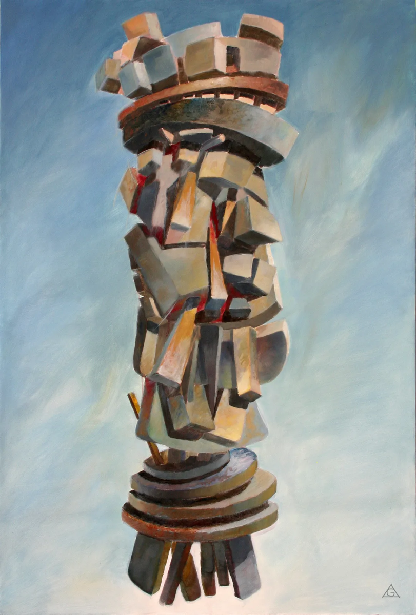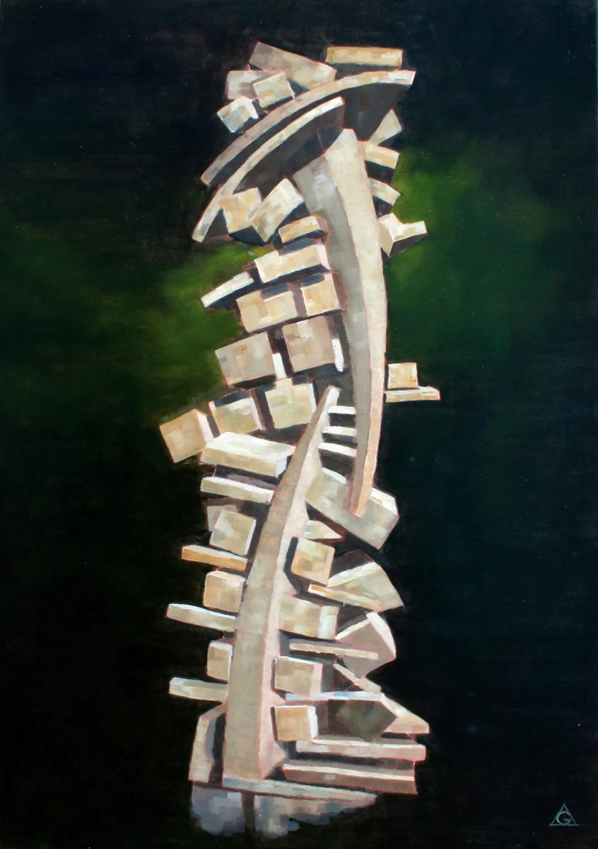 展出的作品以形式的解离隐喻当代身份的脆弱性。图腾、混沌、现代崇拜物、集体悲剧与内在冲突,皆转化为充满象征张力的视觉结构。展览通过绘画、素描与雕塑展开,构建二维图像与立体形态、本能笔触与概念构建之间的对话。巨石不仅是形式,更是人类境遇的无声见证者。