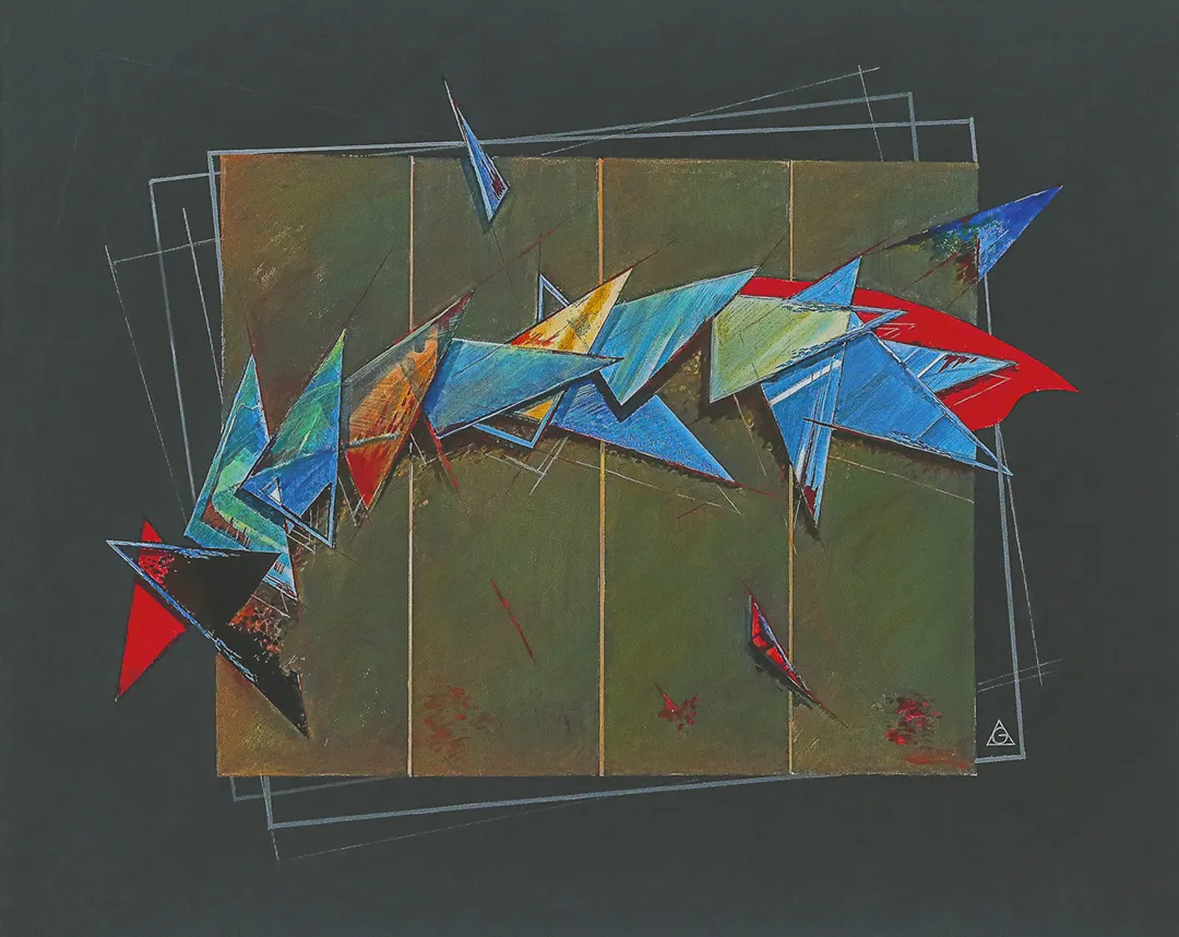 两道猩红笔触在碎片之海中无限趋近却永不相触,诠释爱情中欲望与阻隔的永恒张力。作品收录于Limen艺术奖画册。