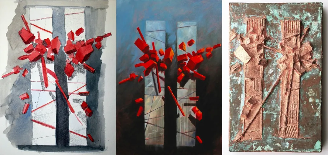 单元呈现《纽约九月》主题创作的三重变奏:手稿、油画与雕塑。完整展示该意象从草图构思到二维绘画乃至三维塑形的演化轨迹。