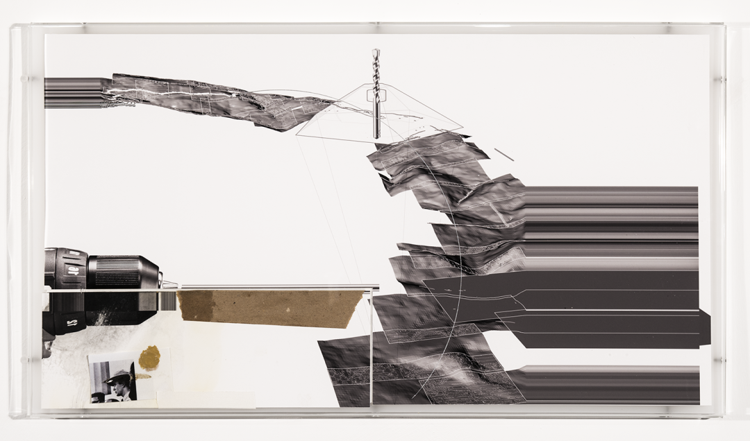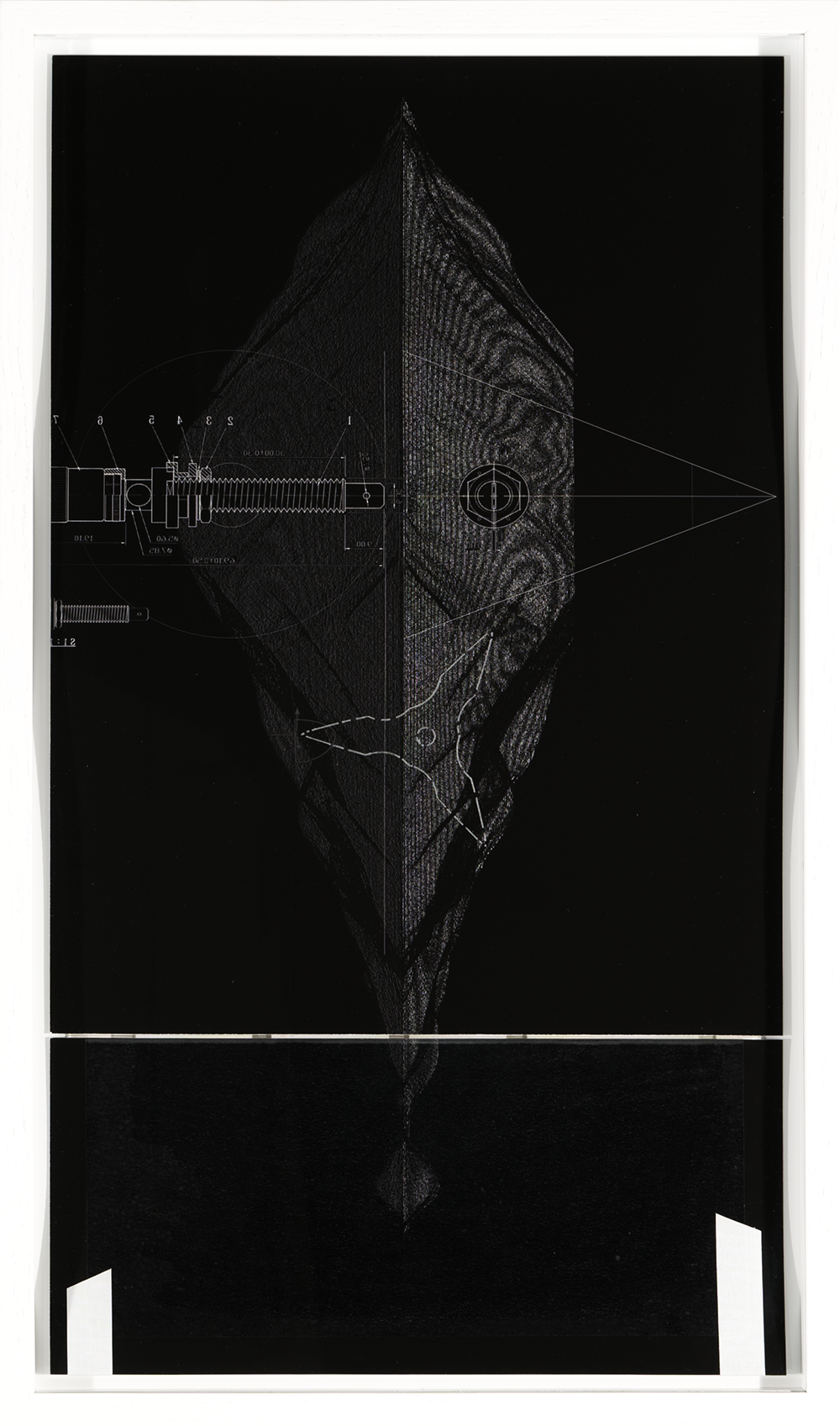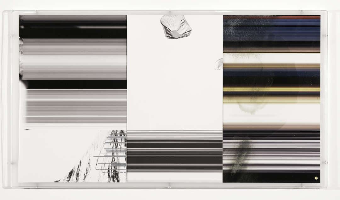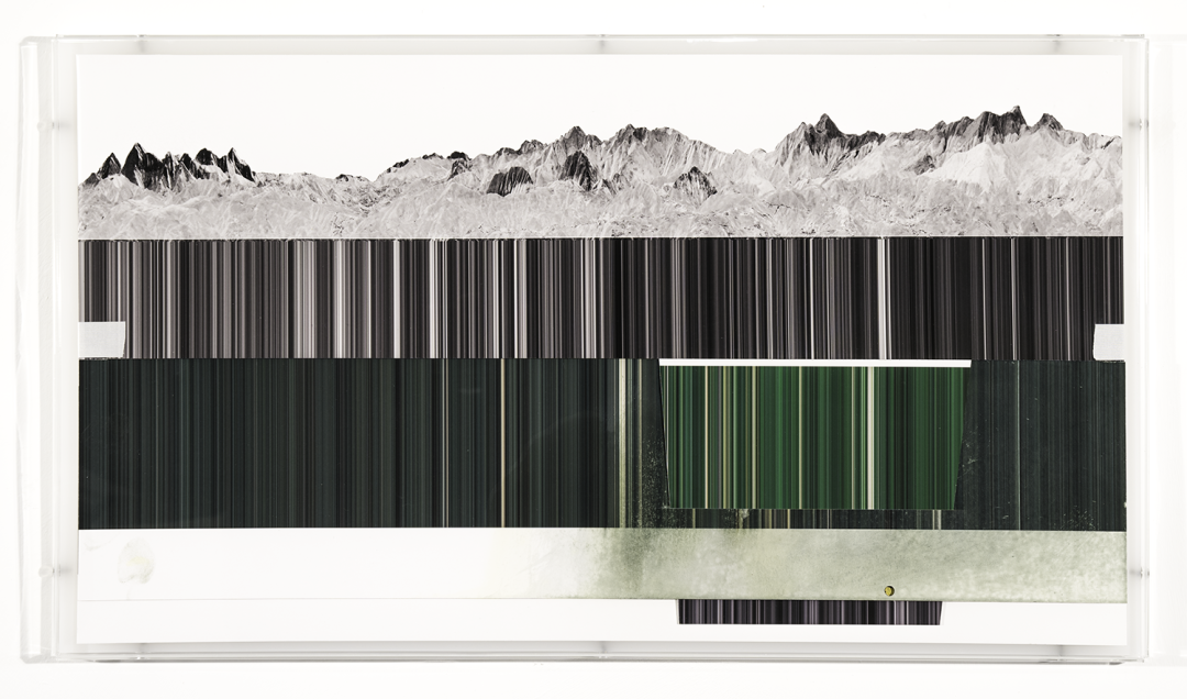 Stampa digitale su carta cotone, tecnica mista, teca/contenitore in policarbonato trasparente termoformato, pannello in policarbonato opalino bianco.