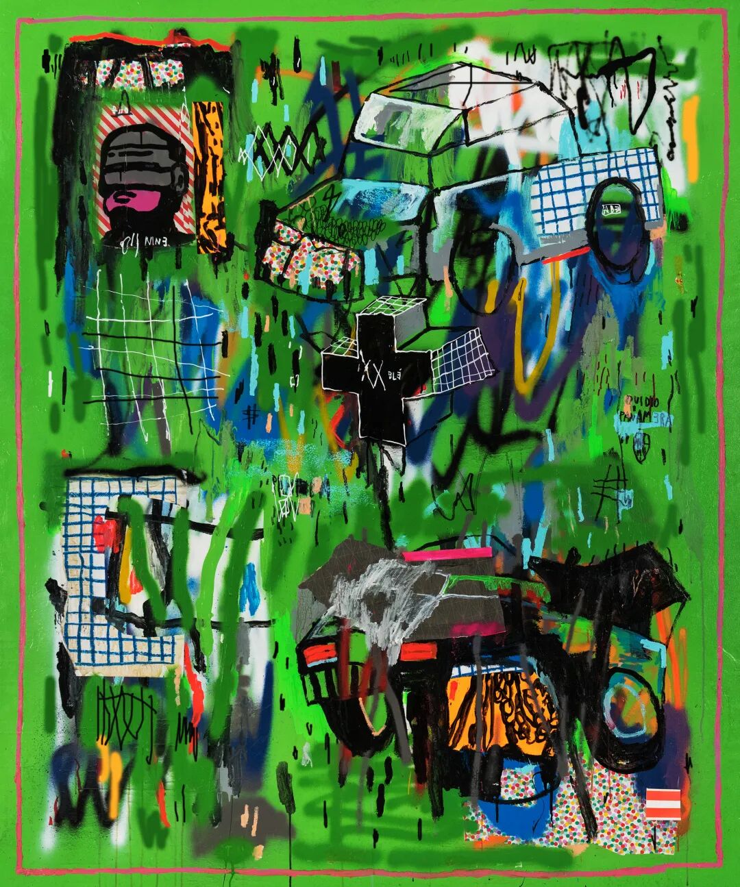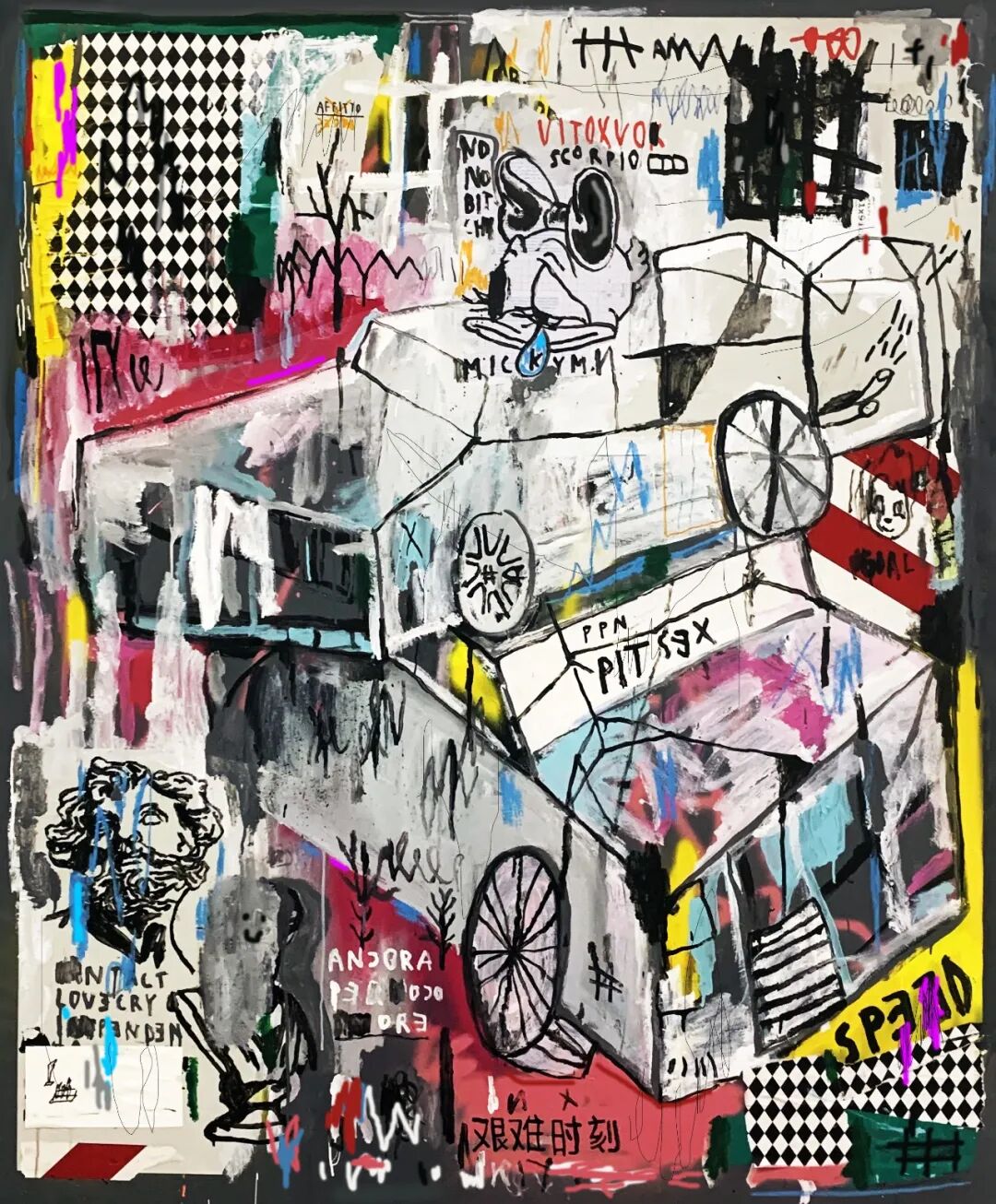 J.P. Italian artist is considered to be the last pupil of K.L.M. , investigates the realities of the suburban in his work by integrating wider considerations on society and on freedom of expression, by relating staff to the social.