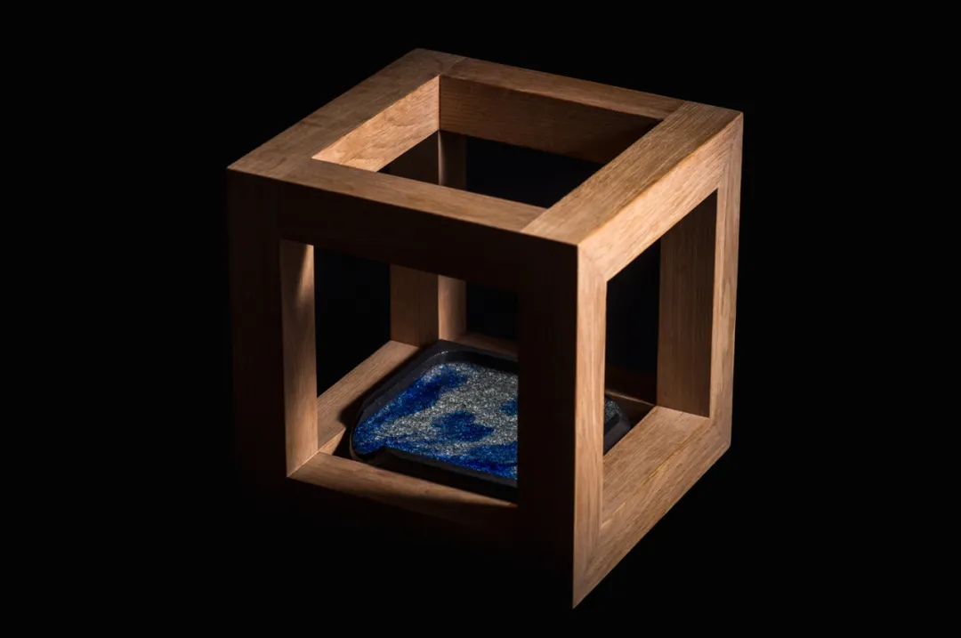 Ceramica colata in stampi, smalto nero matt, massello in doghe di rovere, sapone vegetale, china solida