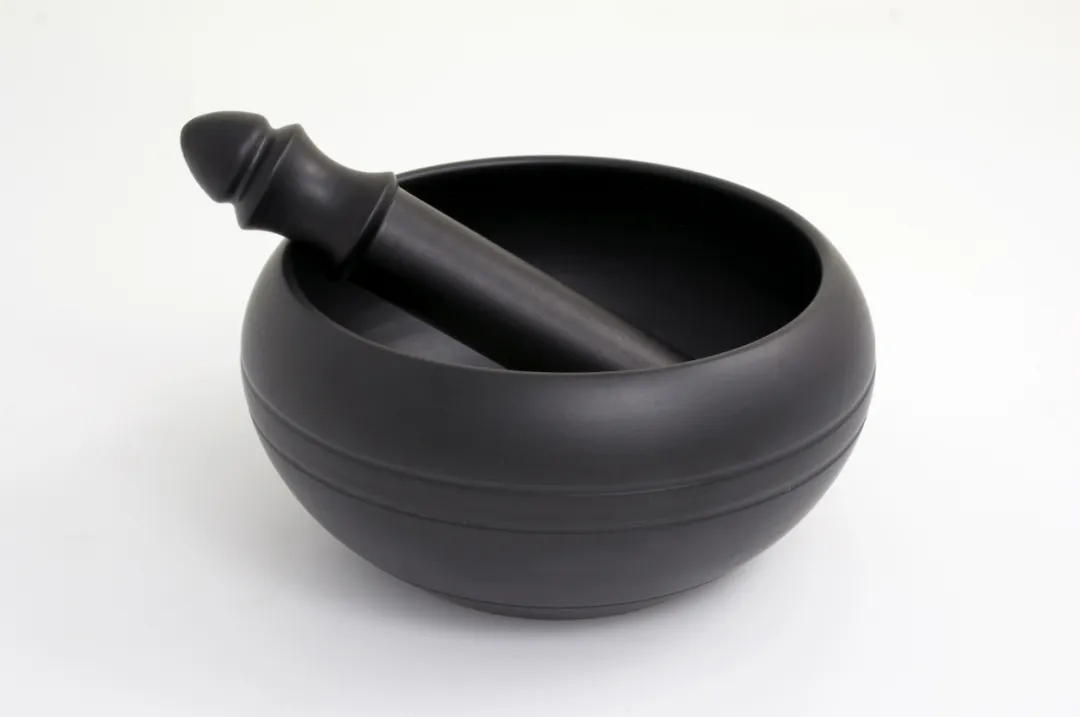Ceramica colata in stampi, smalto a primo fuoco nero matt, massello in moro di gelso