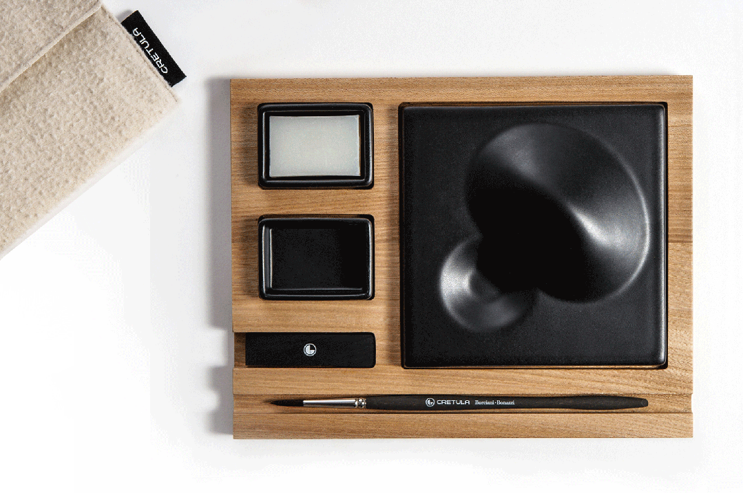 Etna è uno dei primi prodotti sviluppati per il brand e viene proposto come piccolo corredo da scrivania per la pittura ispirato alla tradizionale scrittura orientale a pennello. Tutti gli elementi sono selezionati accuratamente e realizzati artigianalmente per avere sempre in ordine e a portata di mano gli strumenti essenziali per potersi esercitare nella calligrafia e nella pittura a china. Il set è composto da una vasca per sciogliere e diluire la china e da due piccoli contenitori in ceramica smaltata, un pennello, una steccha di china solida, un sapone vegetale per la pulizia e una custodia in lana cotta del Casentino per trasportare ovunque e tenere riuniti tutti gli strumenti. Una rivisitazione tutta italiana di un antichissimo rito che prevede lo scioglimento della bacchetta di china con acqua tramite l’abrasione su pietra e l'utilizzo di un pennello a punta fine per imprimere sulla carta segni netti e stilizzati per afferrare i caratteri e l’essenza delle cose.