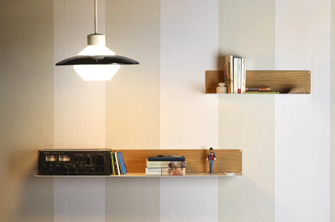 In questo progetto per valorizzare gli oggetti editati dal marchio è stata creata una piccola partitura impiallacciata di quercia che come un abbraccio cinge ed enfatizza la presenza dei libri e delle cose esposte suggerendo momenti di contemplazione e di svago. Il sistema di mensole è caratterizzato da forme e spessori al limite dell’essenziale, dove ogni giunzione è nascosta e rifinita in modo artigianale.
