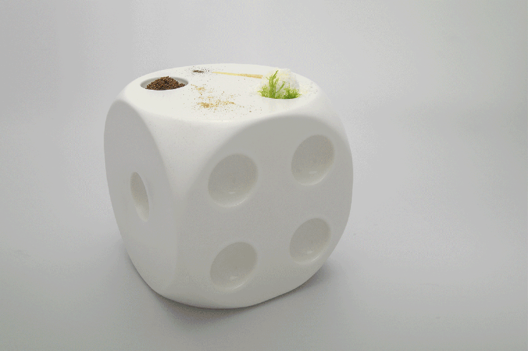 Otto e mezzo e Dadò interpretano la filosofia del marchio Cretula in un servizio da portata che mette in scena le pietanze porzionate e proposte in piccoli scomparti ricavati in accoglienti superfici ceramiche. La configurazione di forme allude a due facce di un cubo legate al gioco del dado e in somma al film di Federico Fellini. Il vassoio serve in tavola il tema del destino, cosa succederebbe se prima d’intessere nuove relazioni fosse possibile stilare un bilancio a posteriori della propria vita sentimentale come suggerisce il regista?