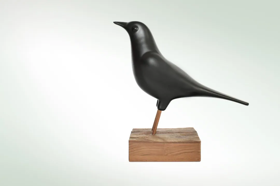 Nelle cantine delle Case Operaie mio padre teneva scansie di gabbie d’uccelli per la caccia al capanno. Bastava sfiorare la porta intessuta di rete della cantina che dal buio si levava un irrequieto frullare di ali e un cinguettio violento a cui rispondevano echi antisonanti dalle cantine vicine. In un piccolo paese appenninico la caccia può diventare un’occupazione totalizzante che diventa scambio quotidiano d’esperienze. I complessi rituali, con intensità diversa, durano tutto dell’anno, ma l’impegno maggiore sono proprio le gabbie da nutrire e accudire giorno dopo giorno. Le poche cartucce utilizzate da mio padre nelle cadenzate giornate trascorse in solitudine al capanno, quasi sempre preso in affitto a stagione iniziata fra quelli rimasti perché ritenuti di scarso interesse, restano come evidente testimonianza di una totale dedizione, esercitata in modo rituale per ricordare i gesti condivisi. Ho spesso cercato d’immaginare come trascorressero i momenti nel silenzio fra mio padre e mio nonno Cecco, che non ho mai conosciuto. Il piccolo nume che ho ideato vuole celebrare il principe di tutti i richiami, il merlo, una citazione ai corvi di Charles e Ray Eames realizzato da Charles Perdew nel lontano Illinois, con un’altra storia da raccontare.