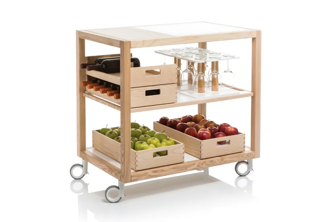 La struttura modulare componibile in legno di frassino può essere attrezzata con vari accessori che ne definiscono l’uso e il carattere. In questa configurazione su ruote il prodotto è vocato alla degustazione di vini accompagnata da frutta, salumi e stuzzichini da poter preparare su un tagliere di legno massello riposto sul piano. Corredato di piani d’appoggio e un porta posate in Corian®, oltre a comode cassette in legno per conservare la frutta e per collezionare vini d’annata, l’isola felice si muove per portare il gusto e muovere i sapori dalla cucina agli altri ambienti della casa.