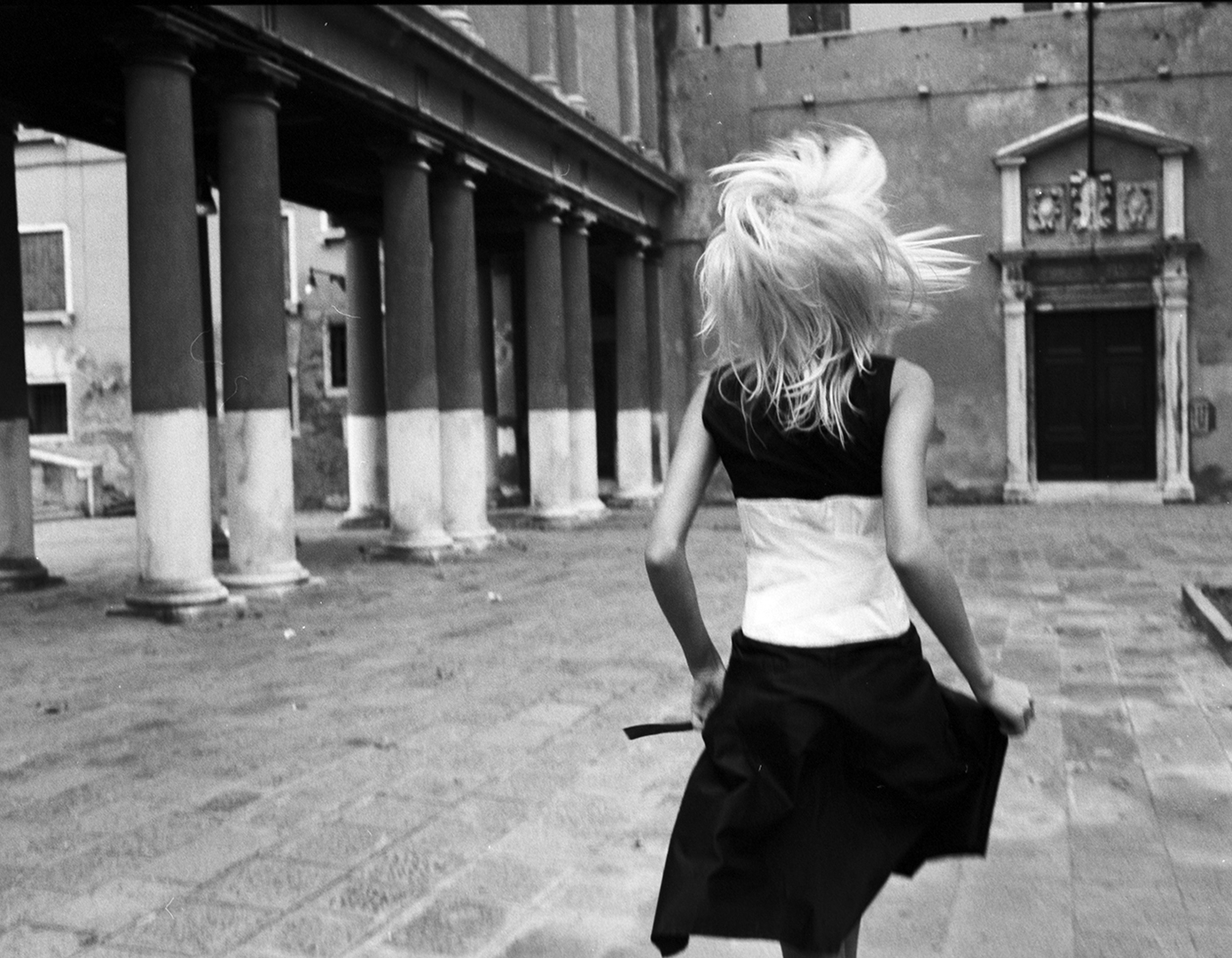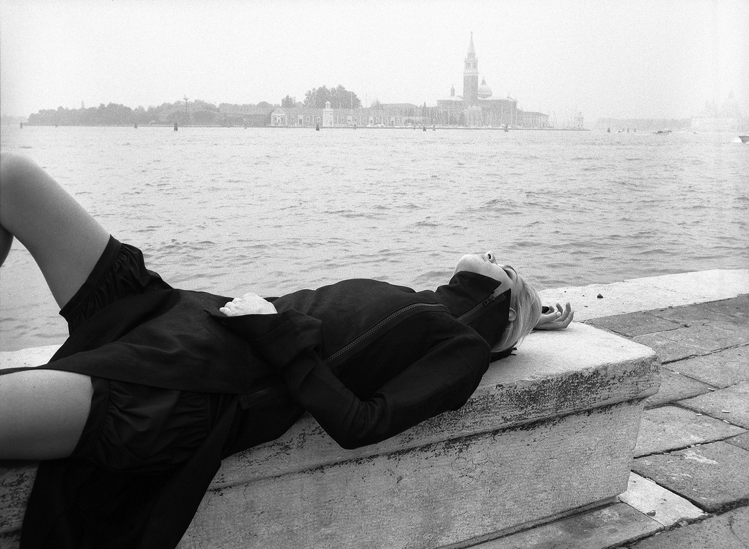 Venezia diventa membrana visiva. Le strutture, i riflessi, i piani verticali e orizzontali partecipano a un sistema fluido, dove tutto si modula con continuità. L’illuminazione filtra, avvolge, incide, raccoglie la transitorietà del corpo e la distribuisce lungo l’intera inquadratura.