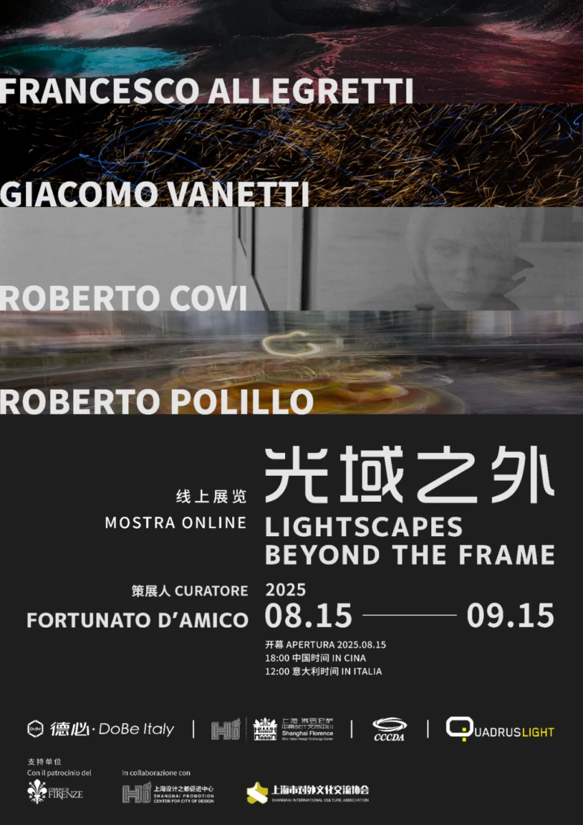 La mostra d'arte collettiva online "LIGHTSCAPES BEYOND THE FRAME", organizzata da DoBe Italia, Centro Sino Italiano di Design, Associazione per lo Sviluppo degli Scambi Culturali Internazionali (CCCDA) e Quadruslight, con il patrocinio del Comune di Firenze e il supporto dello Shanghai Promotion Center for City of Design e della Shanghai International Culture Association, è stata inaugurata alle ore 12:00 (ora italiana) del 15 agosto 2025. La mostra è curata dal curatore italiano Fortunato D'Amico, con la partecipazione di quattro artisti italiani: Francesco Allegretti, Giacomo Vanetti, Roberto Covi e Roberto Polillo.