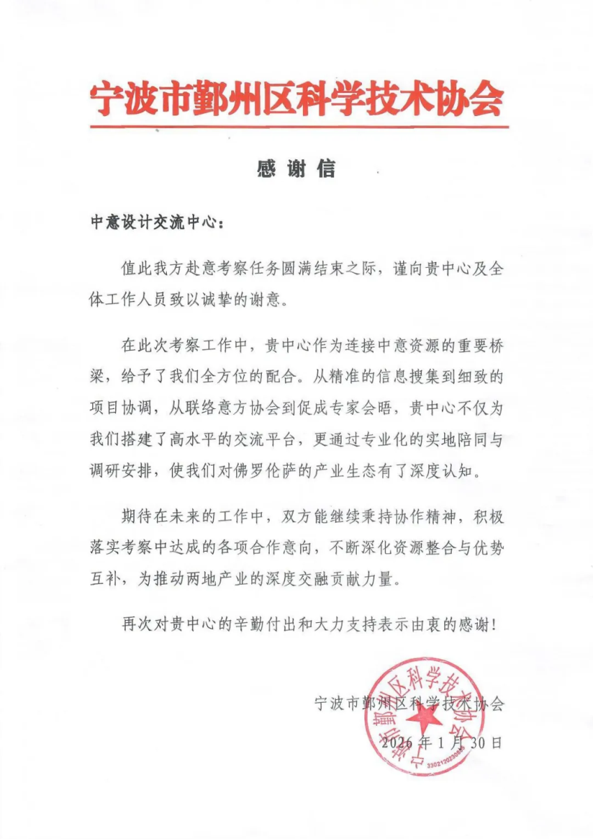 On January 30, 2026, the Sino-Italian Design Exchange Centre (SIDEC), an initiative operated by DoBe Group, was honored with a formal letter of appreciation from the Ningbo Yinzhou District Science and Technology Association. The communication offered high praise for the Centre’s exemplary organizational proficiency and professional collaborative ethos displayed during the Yinzhou delegation’s recent strategic research mission to Florence, Italy.