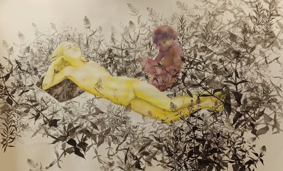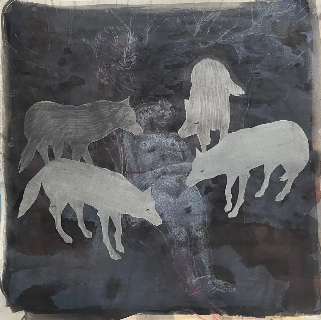 我所选用的媒介不容许丝毫犹疑。我主要在纸本上使用蛋彩、水彩或墨水,因为我渴望每一幅作品都能展露笔触的生动,并在某种“不完美”中保留自发的痕迹。有时,我会借用拼贴来顺应直觉,运用各种元素、形态与色彩,让自己得以离题漫游,或仅仅是为了沉浸于某种心境之中。