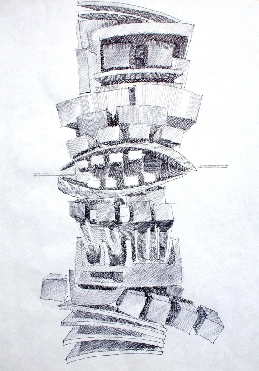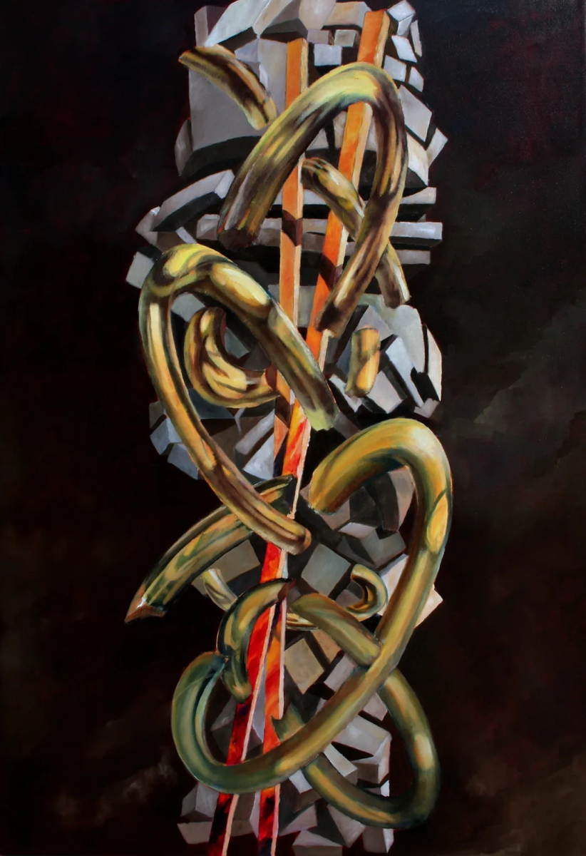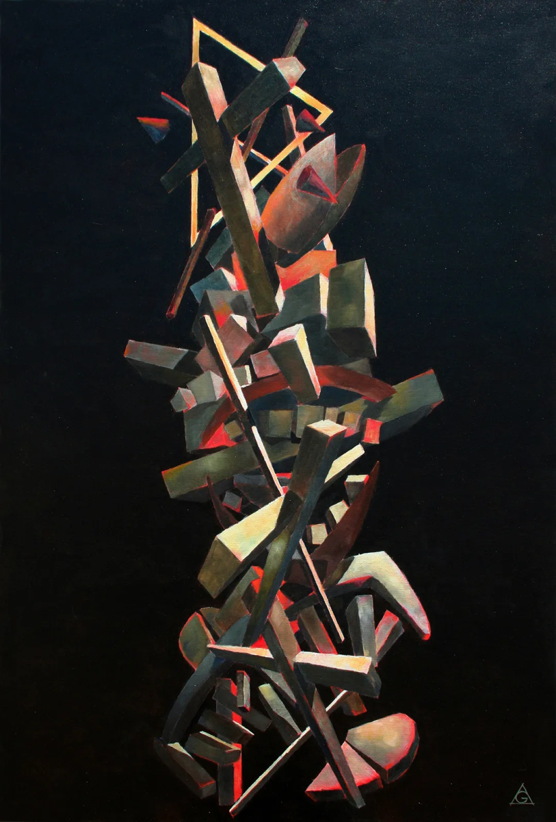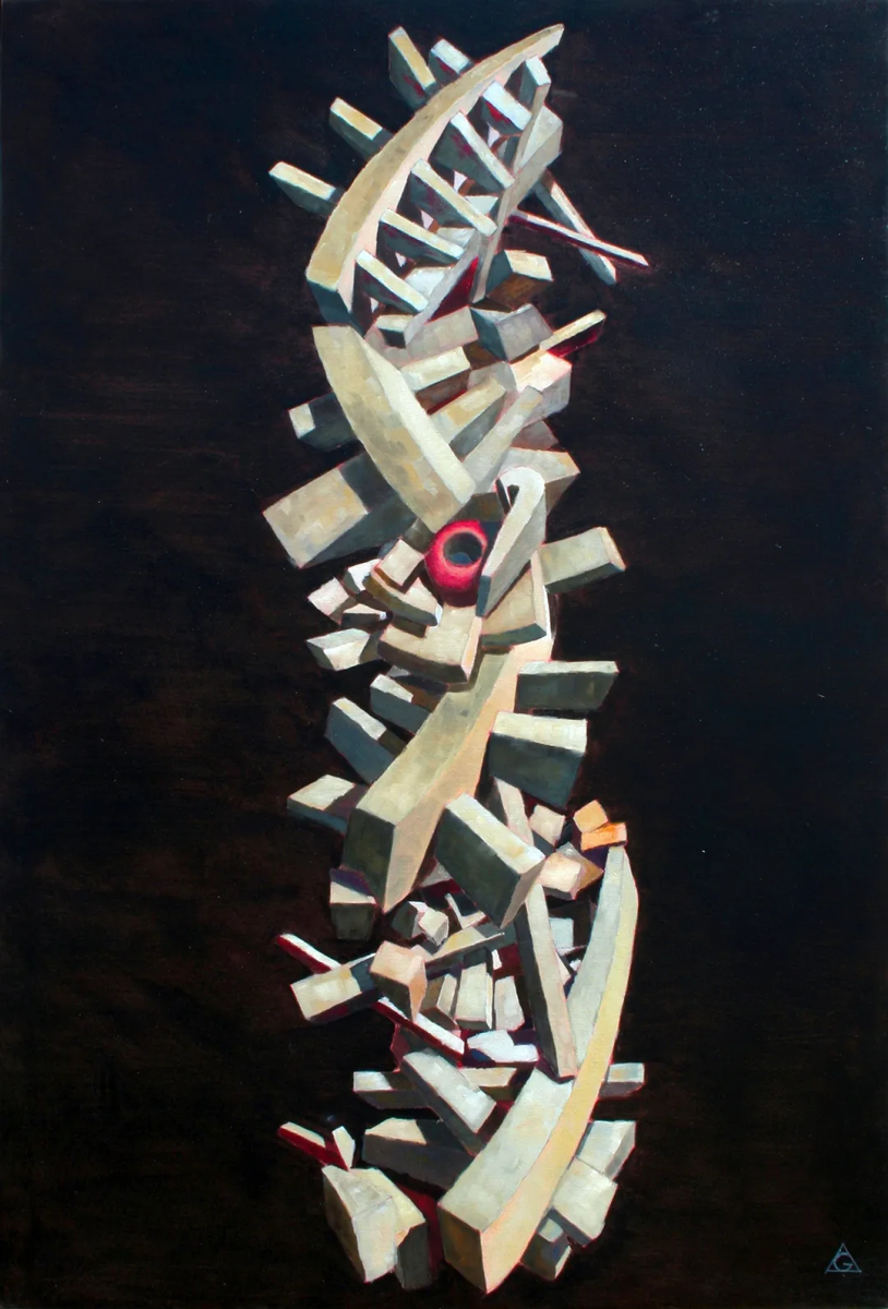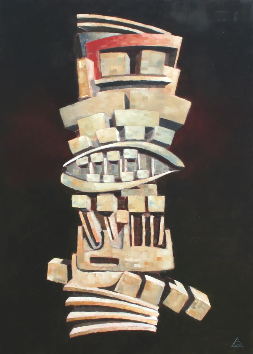 展出的作品以形式的解离隐喻当代身份的脆弱性。图腾、混沌、现代崇拜物、集体悲剧与内在冲突,皆转化为充满象征张力的视觉结构。展览通过绘画、素描与雕塑展开,构建二维图像与立体形态、本能笔触与概念构建之间的对话。巨石不仅是形式,更是人类境遇的无声见证者。