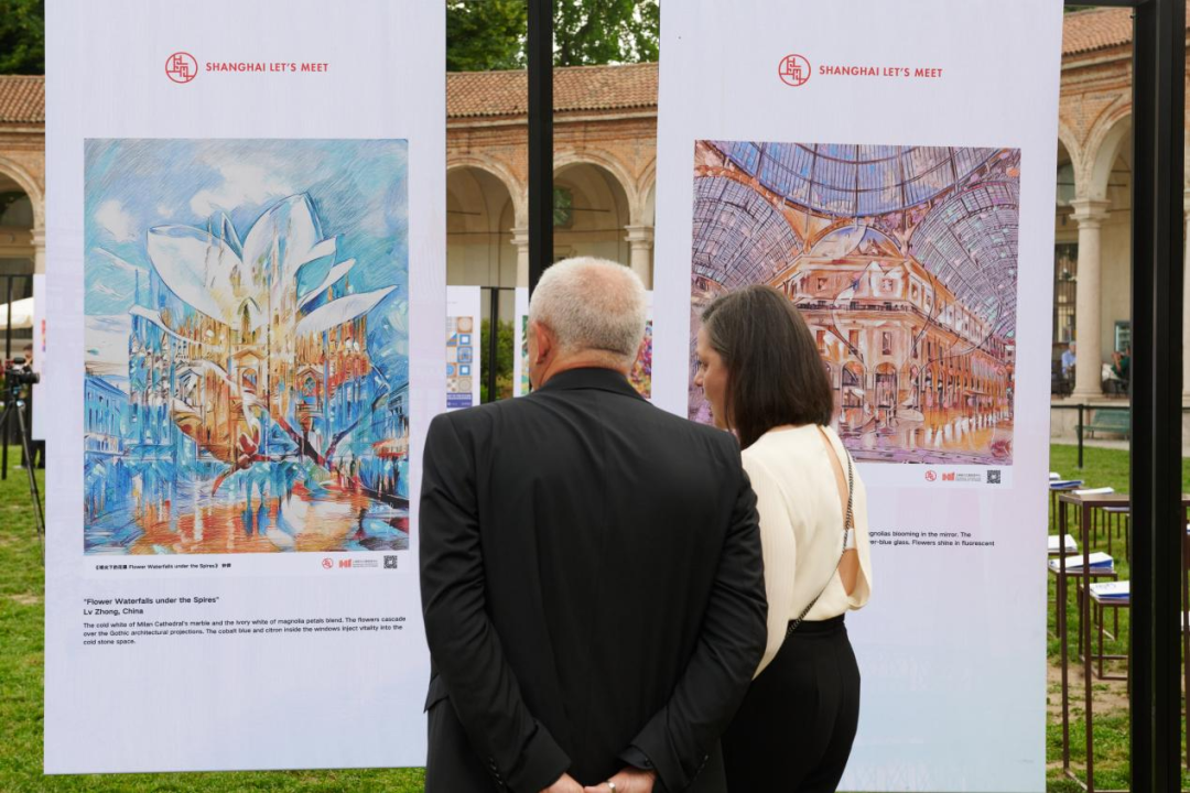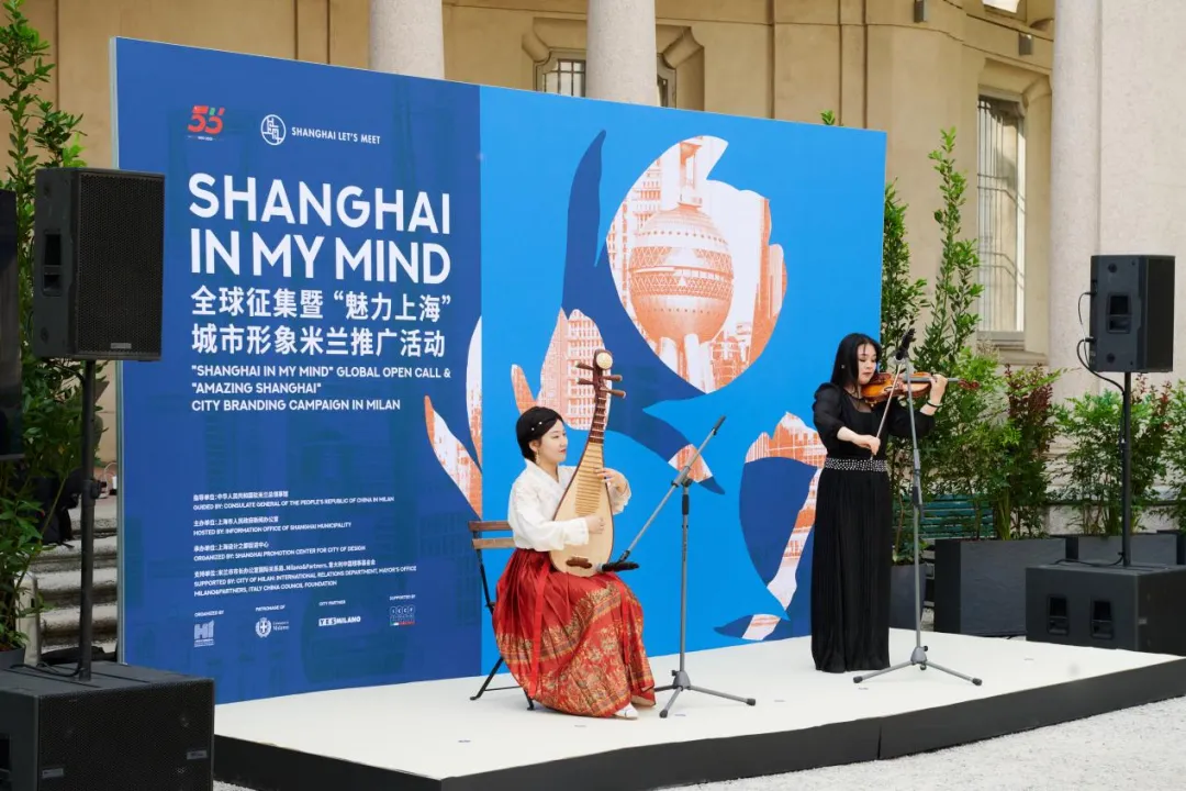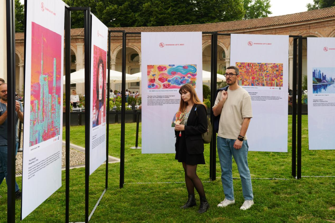 琵琶与小提琴合奏《茉莉花》和《今夜无人入眠》拉开活动序幕,将意式美学与东方雅韵完美融合。巡展呈现了40幅以“上海印象”为主题的艺术作品,分别来自中国、法国、意大利、日本、新西兰、美国等17位艺术家和设计师创作。其中《江河之吻》创作源于上海与米兰城市地标,成为本次展览的点睛之作。